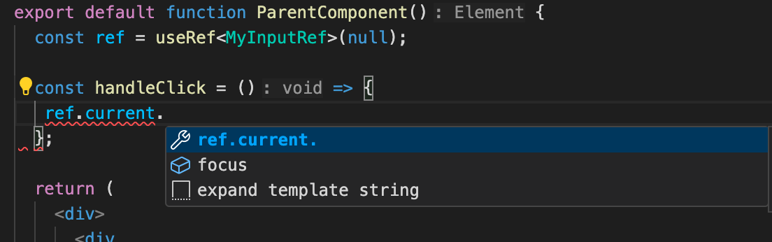 }이제 useImperativeHandle 활용하여 focus 메서드 만을 노출시키고자 합니다. MyInputRef의 타입을 다음과 같이 변경하여 자식과 부모 모두 ref 타입을 변경해 주었습니다.